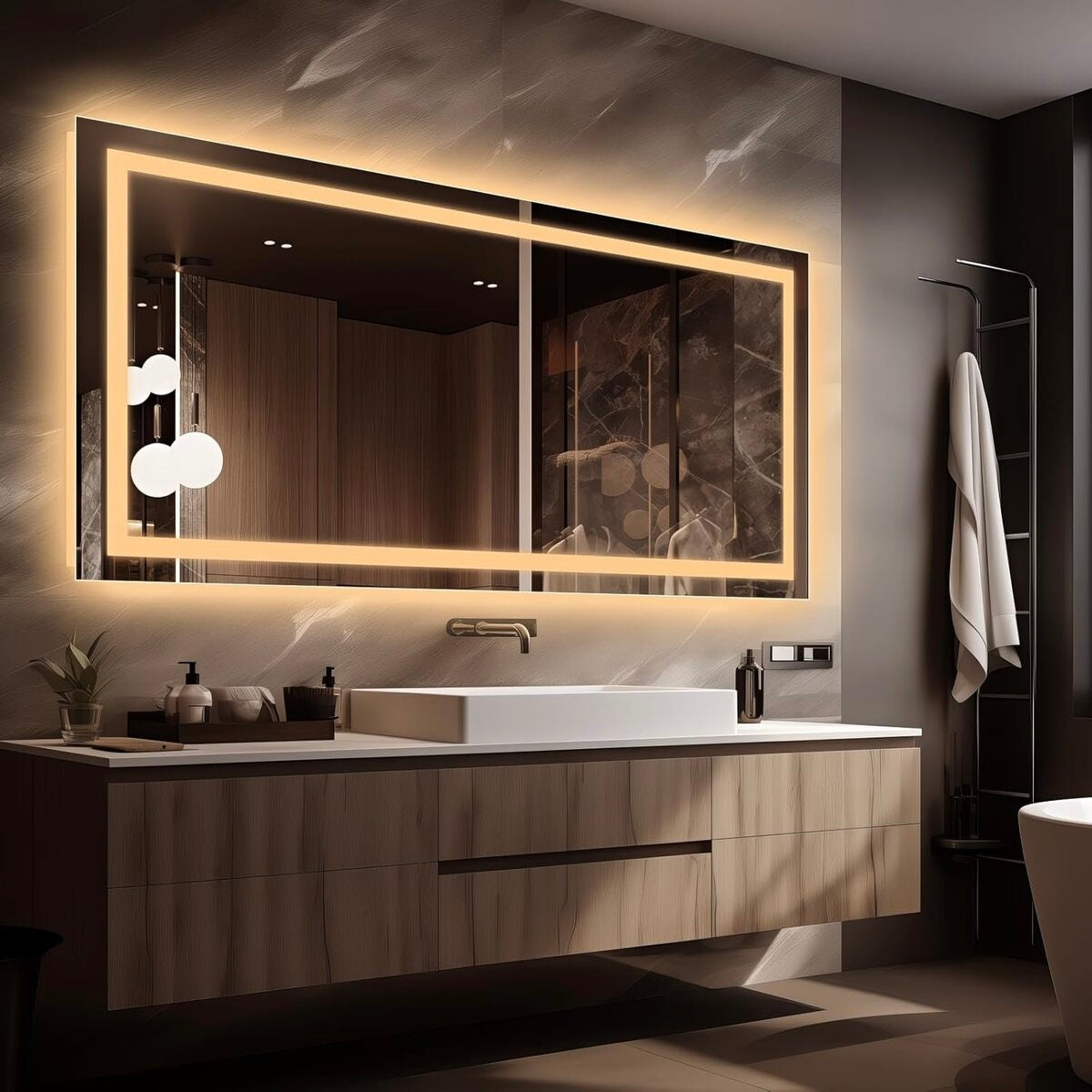 Espelho Retangular com LED Jateado 60x40 cm Lapidado com Botão Touch-Screen Premium. Led a escolher nas Cores: Branco Frio ou Branco Quente ou Branco Neutro.