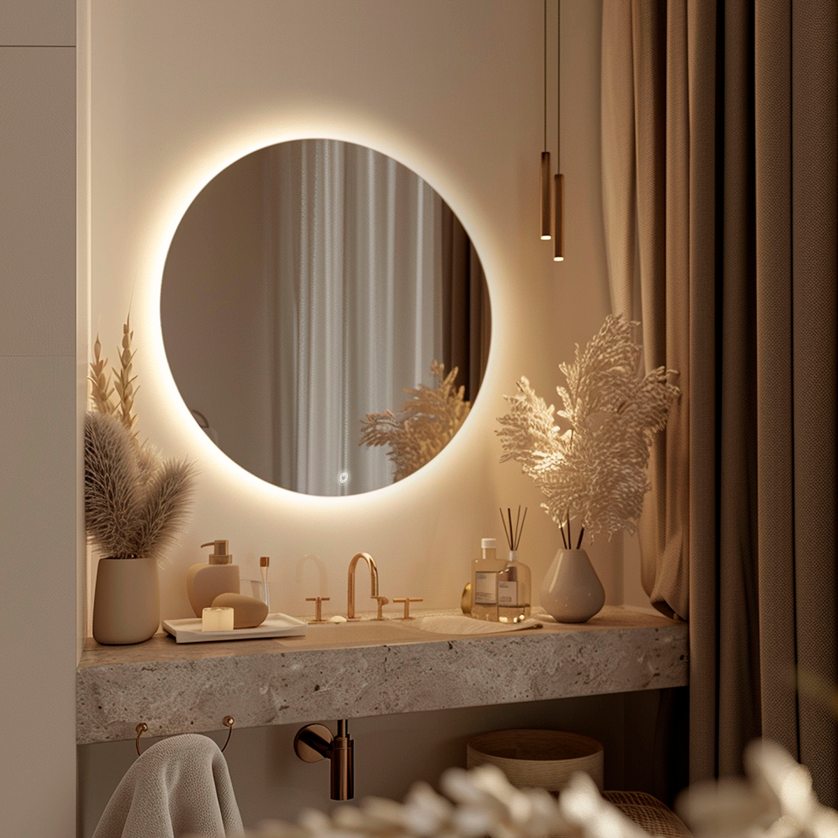 Espelho Redondo com LED Luz Indireta de Fundo Tamanho 70X70 cm Lapidado com Touch Screen Luxo. Led a escolher nas Cores: Branco Frio ou Branco Quente ou Branco Neutro.